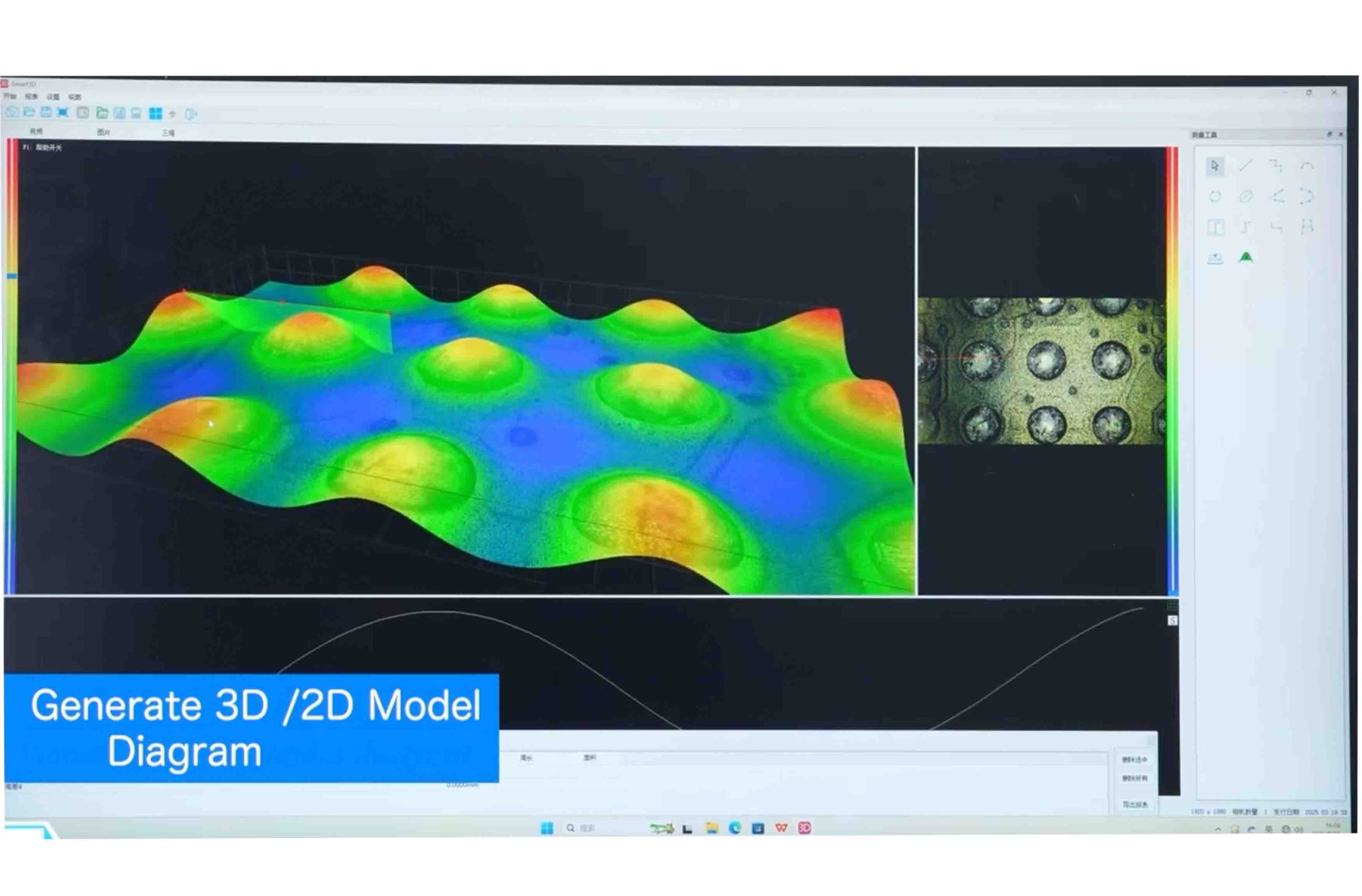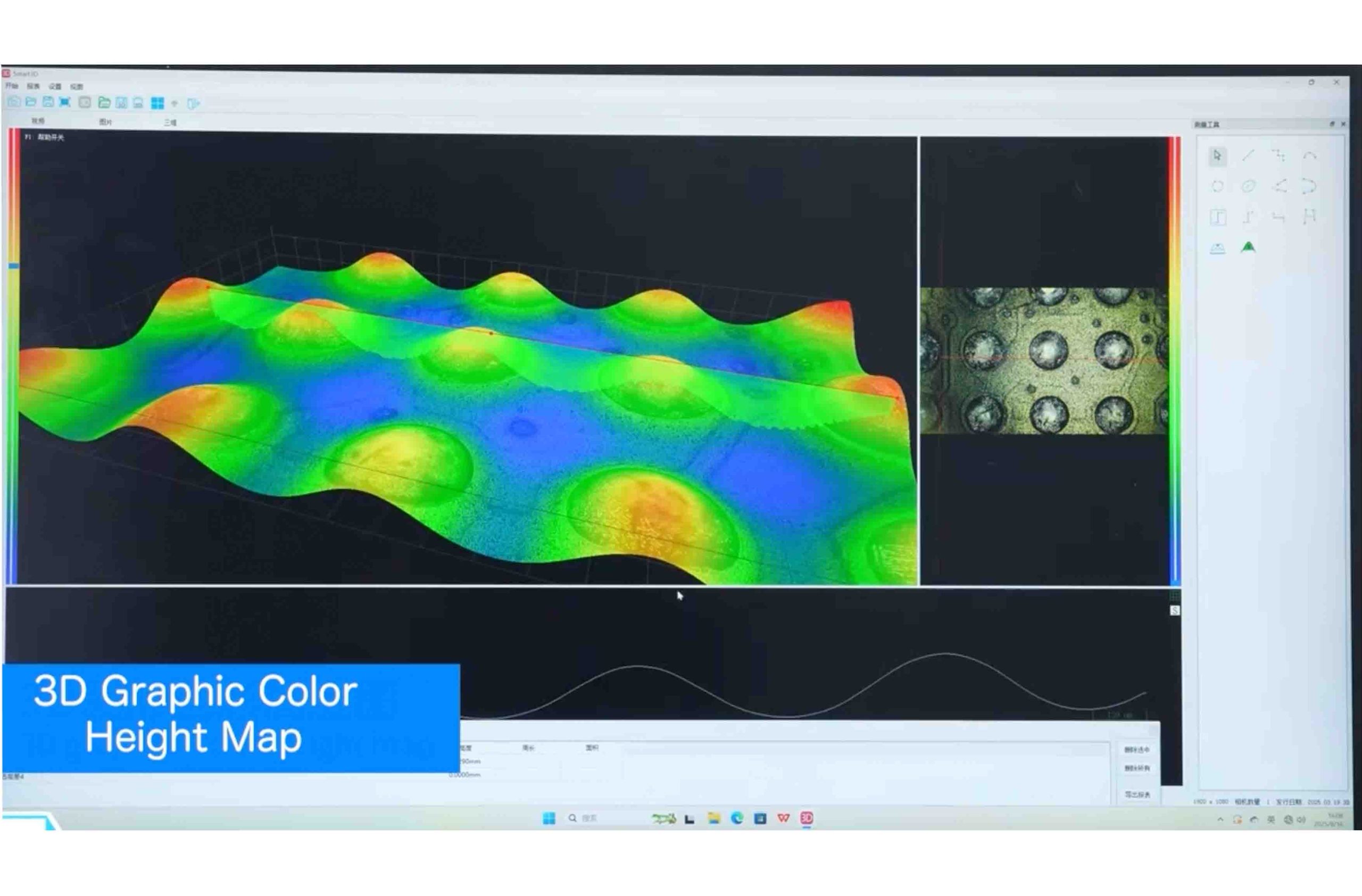 The camera provides a wealth of 3D tools for easily measuring any position of the 3D model and recording the data in real time. With the metallographic microscope of 10X objective lens, the Z-axis measurement accuracy and repeatability is ±2μm and ±1μm. The higher magnification objective lens, and the higher precision data.